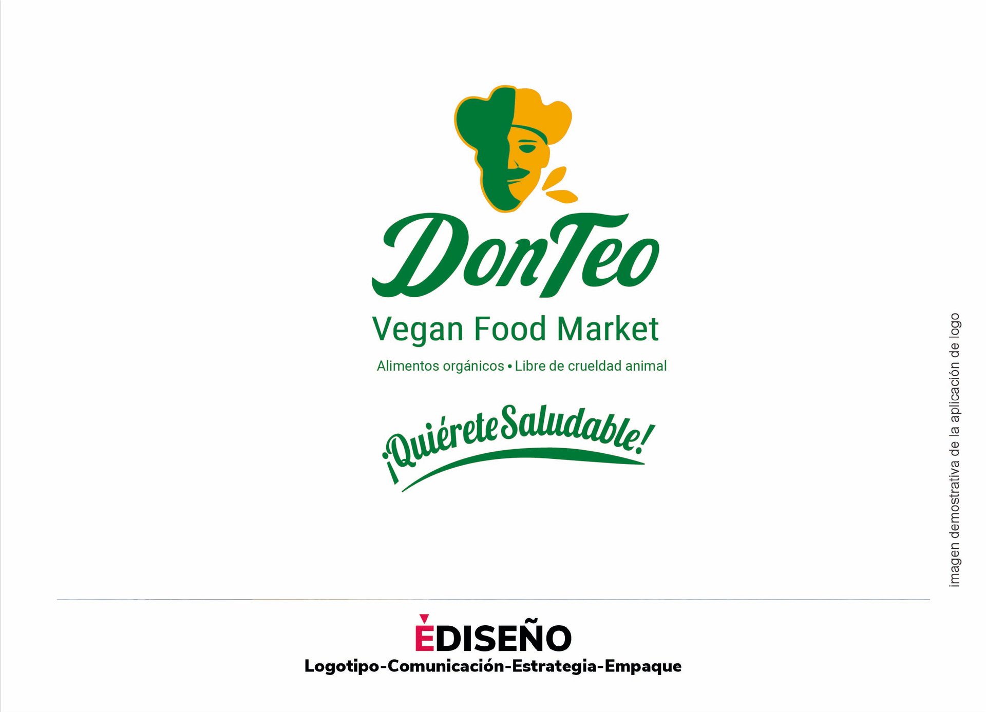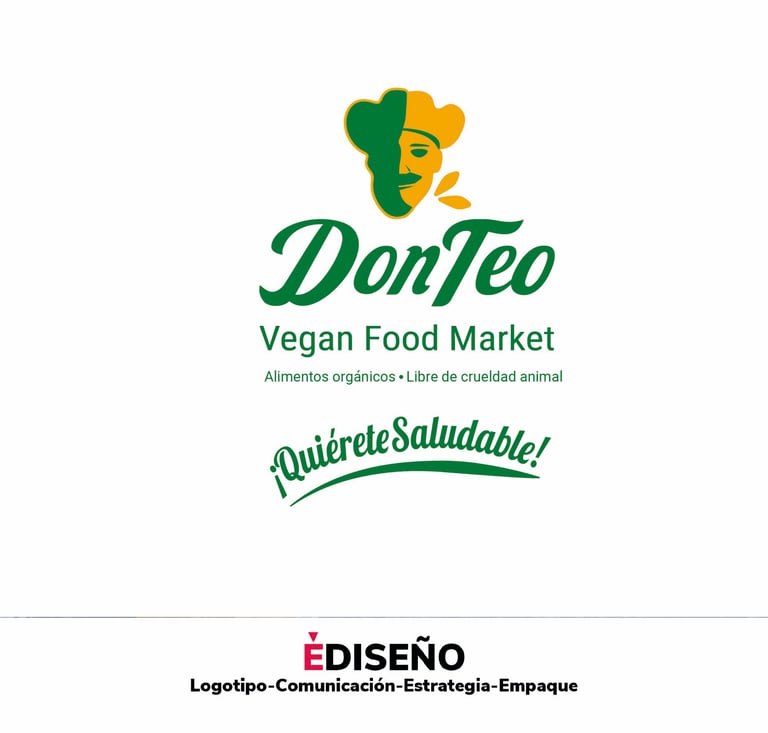 Realizamos el rediseño de la marca Don Teo Organic Food. El símbolo marcario Don Teo es un Imagotipo desarrollado a partir de lo establecido en el logotipo anterior buscando simplificarlo sin que perdiera su espíritu, con una tipografía rediseñada desde la fuente Lobster dándole un acabado de leterin que lo hace único, coronado con el pictograma figurativo de lo que se sugiere es Don Teo y acompañado por un tagline claro, que describe lo que hacemos sin confusión con un carácter universal y ampliando su perspectiva del futuro se dispuso en idioma inglés Vegan Food Marked ya que el anterior podía confundirse con restaurante y no como una tienda en linea de productos veganos. Así también se les creo un slogan contundente "Quiérete Saludable".