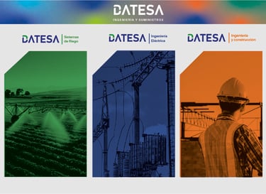 El desarrollo de esta marca fue un reto importante para generar una comunicación clara, dúctil y sincera. DATESA Ingeniería y Suministros es una empresa con tres áreas de servicio: Ingeniería y Suministros, Ingeniería Eléctrica e Ingeniería y Construcción. La solución fue establecer una marca fuerte que muestra dinamismo y contundencia con los diferentes rubros expresados como aditamentos textuales con una diferenciación a través de colores que distingan cada servicio y una línea vertical que le brinda contundencia y sobriedad.