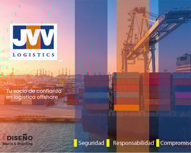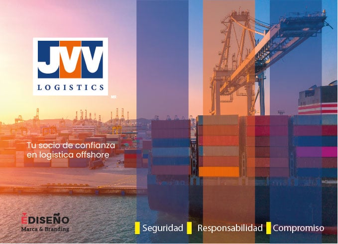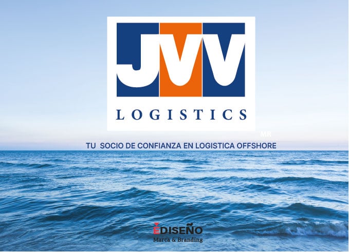 La creación de la marca para esta empresa de gran prestigio en su ramo, esta construida con estilo tipográfico donde la J nos refiere un gancho de grúa y la V V barcos alineados. Lo acompaña la palabra logistics con una fuente que le da un carácter elegante, de gran fortaleza y confianza, enmarcada en tres cajas en sus colores institucionales que nos refiere contenedores alineados.